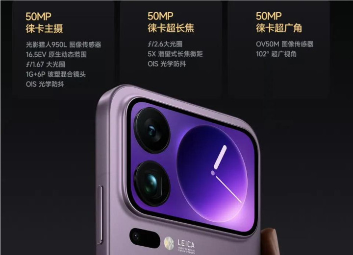 后置徕卡三摄:5000万像素光影猎人950L主摄(16.5EV动态范围)+5000万像素豪威OV50M超广角+5000万像素三星GN8潜望长焦。