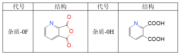 有关物质方法Ⅱ:主要检测杂质-0F与杂质-0H,此两杂质在有关物质条件下出峰较早,干扰测定,单建方法进行检测。其中杂质0F和杂质0H极性极大,采用常规C18色谱柱基本没有保留;杂质0F和杂质0H结构中均含有N原子,在酸性的流动相条件下,这两个化合物带正电荷,此时采用含有庚烷磺酸钠的流动相时,带正电的两个化合物会和带负电的庚烷磺酸钠基团形成静电作用,从而保留增强。