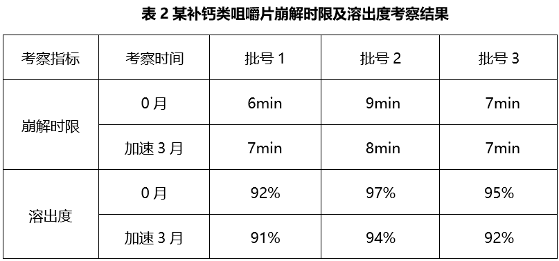 为有效的控制自制品的批间均一性及货架期间稳定性,为生产参数的制定提供依据,同时保证咀嚼片在临床使用期间由于部分人群咀嚼不完全导致临床疗效的差异,故推荐按照普通速释片的崩解时限及溶出度标准确定咀嚼片的控制标准。参考USP<2040>相关规定将某补钙类咀嚼片内控崩解时限拟定为不得过30min,参考USP同品种普通速释片剂将在盐酸介质中30min的溶出度拟定为不得过75%。对多批次自制品进行考察,结果见表2。