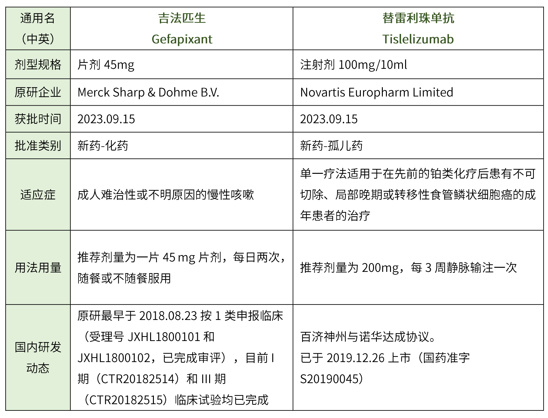 共计5个,其中化药3个(吉法匹生片、艾拉司群片、克立他酶注射液,生物药2个(替雷利珠单抗注射液、艾可瑞妥单抗注射用浓溶液),药物详细信息见下表。