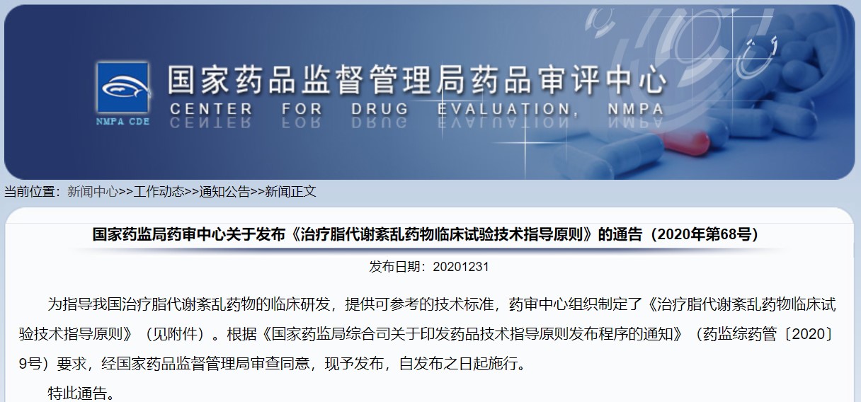 关于发布《治疗脂代谢紊乱药物临床试验技术指导原则》的通告(2020年第68号)