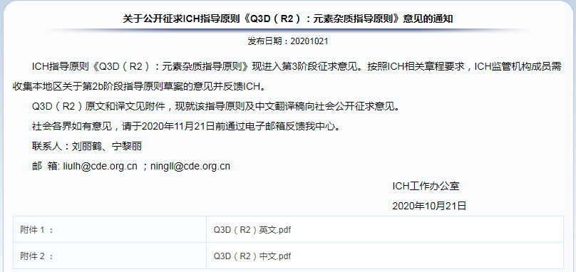 ✎ 关于公开征求ICH指导原则《Q3D(R2):元素杂质指导原则》意见的通知