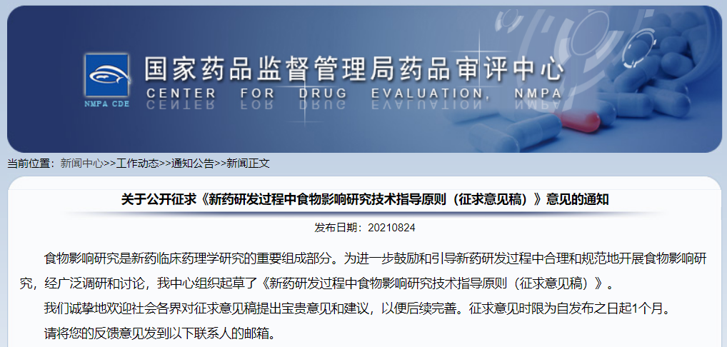 关于公开征求《新药研发过程中食物影响研究技术指导原则(征求意见稿)》意见的通知