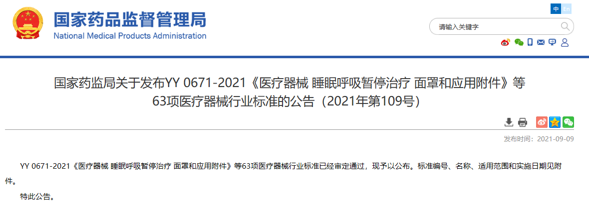 国家药监局关于发布YY 0671-2021《医疗器械 睡眠呼吸暂停治疗 面罩和应用附件》等63项医疗器械行业标准的公告(2021年第109号)
