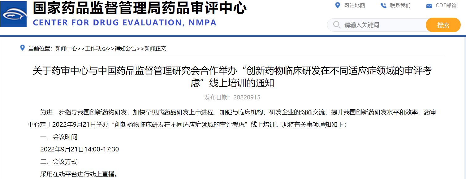关于药审中心与中国药品监督管理研究会合作举办“创新药物临床研发在不同适应症领域的审评考虑”线上培训的通知